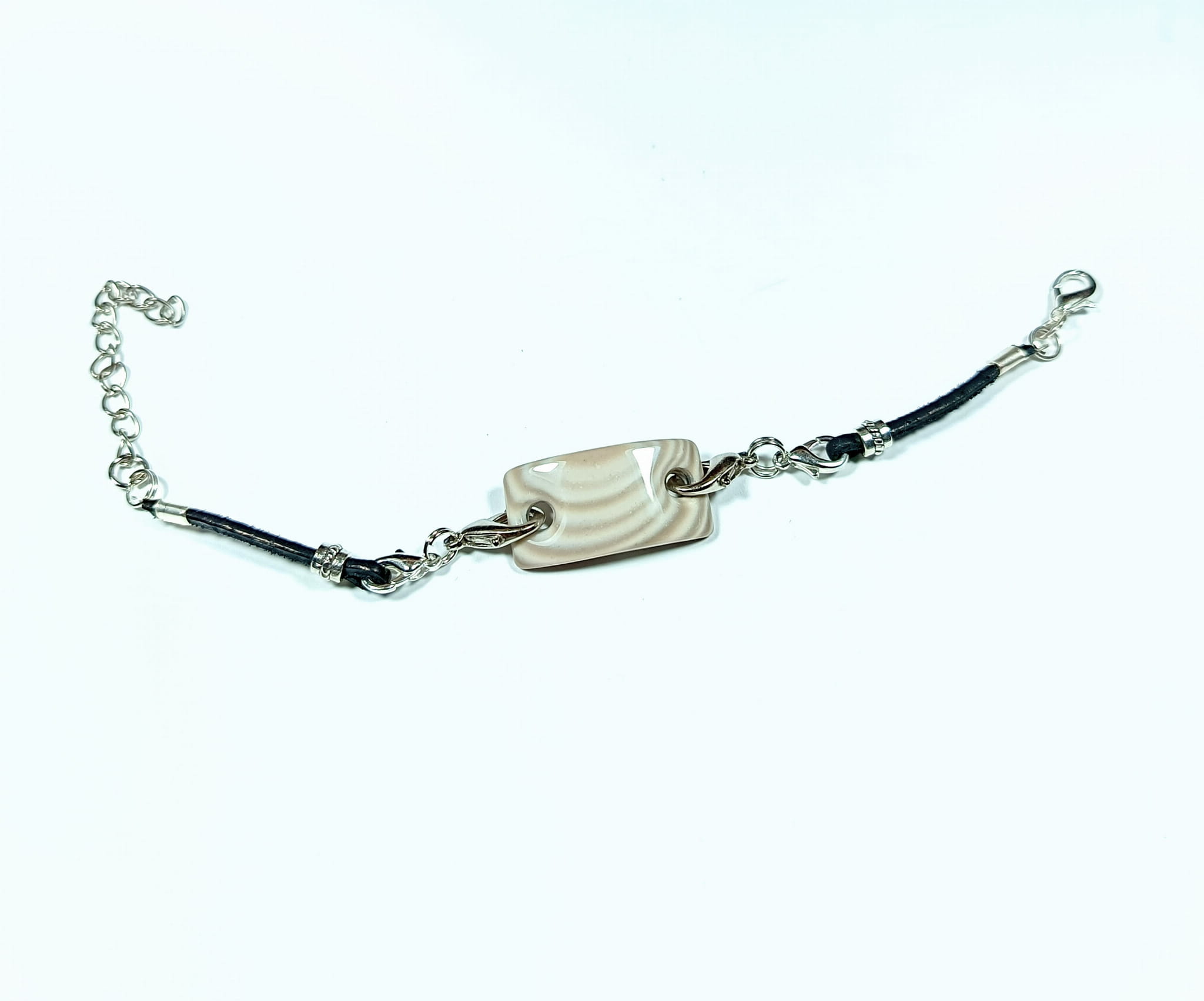 Bransoletka z jaspisu dalmatyńczyk na czarnym rzemieniu z metalowymi przekładkami 17 cm + 4 cm przedłużka