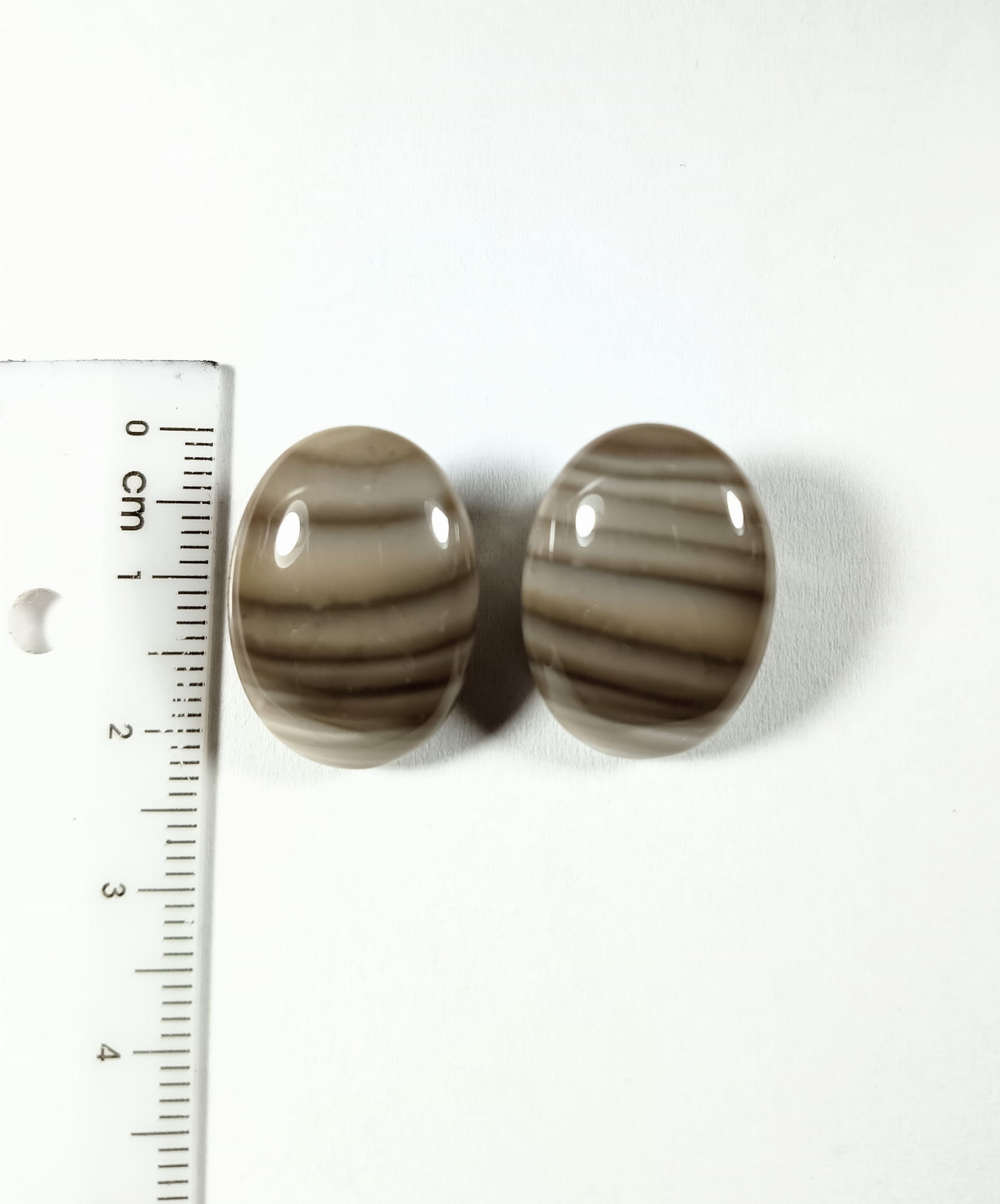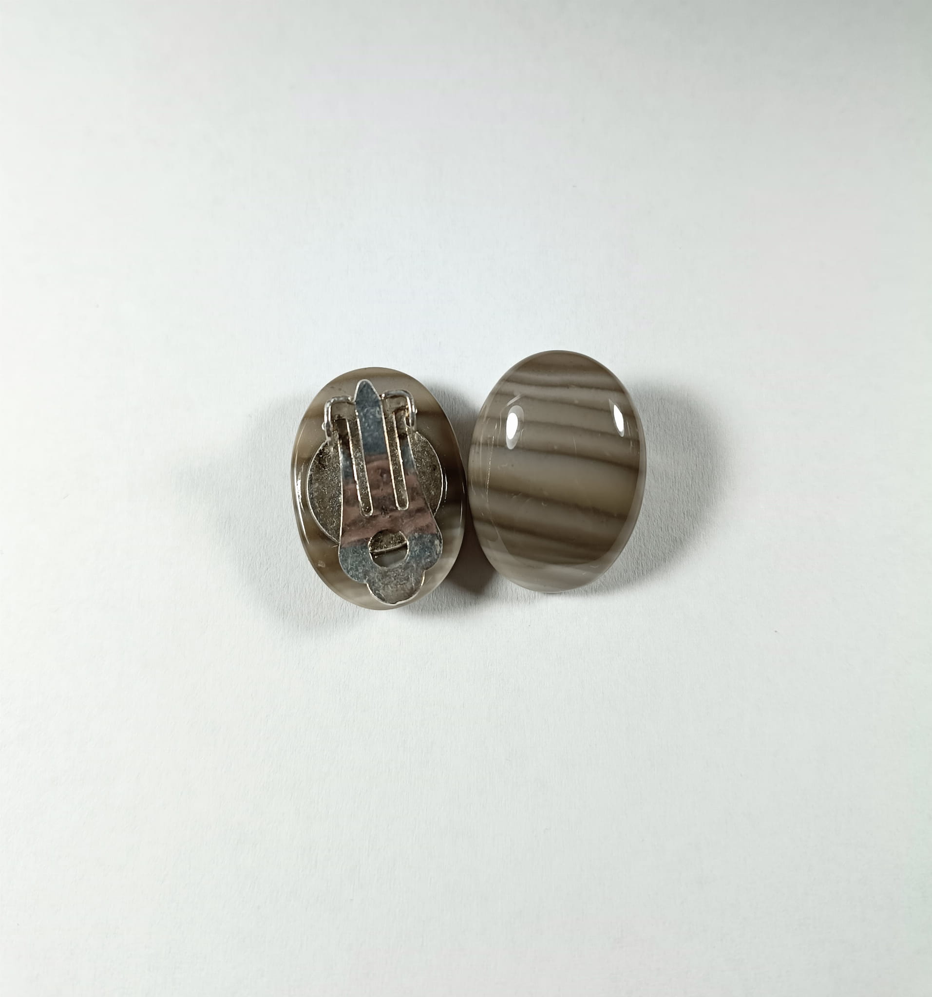 Owalne krzemienie pasiaste o niemal lustrzanym odbiciu zostały umocowane na metalowych klipsach klejem dwuskładnikowym jubilerskim, który jest niezwykle trwały.