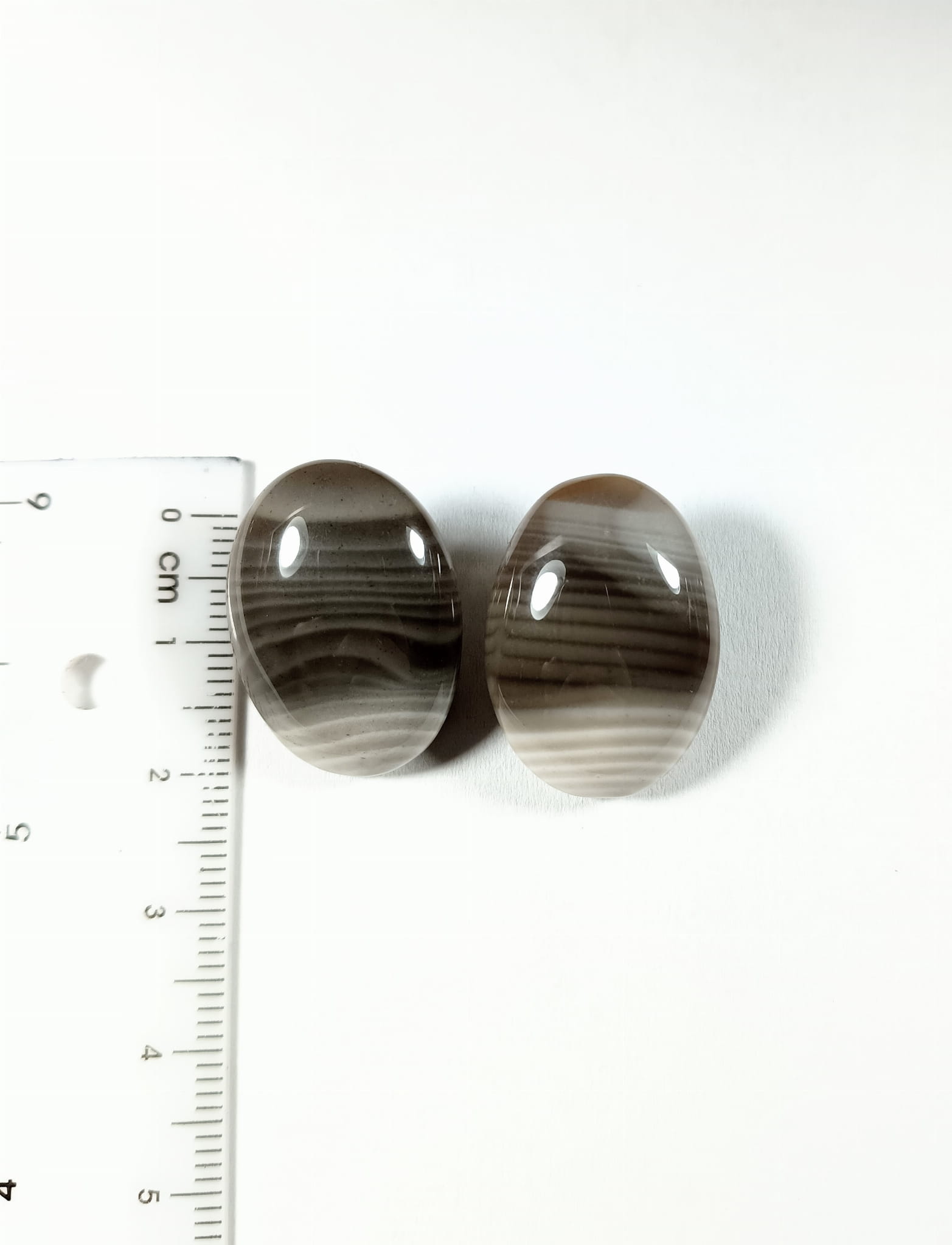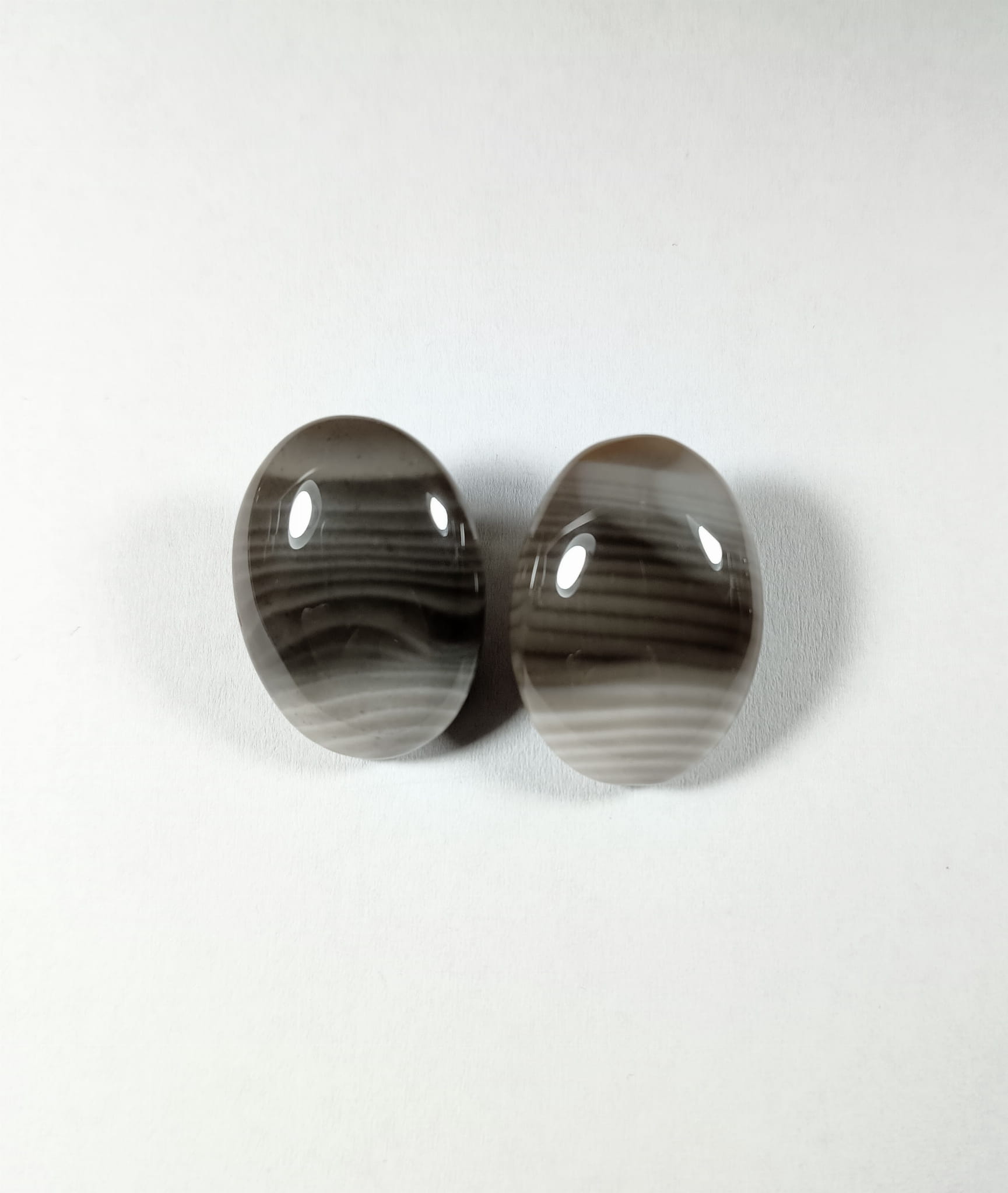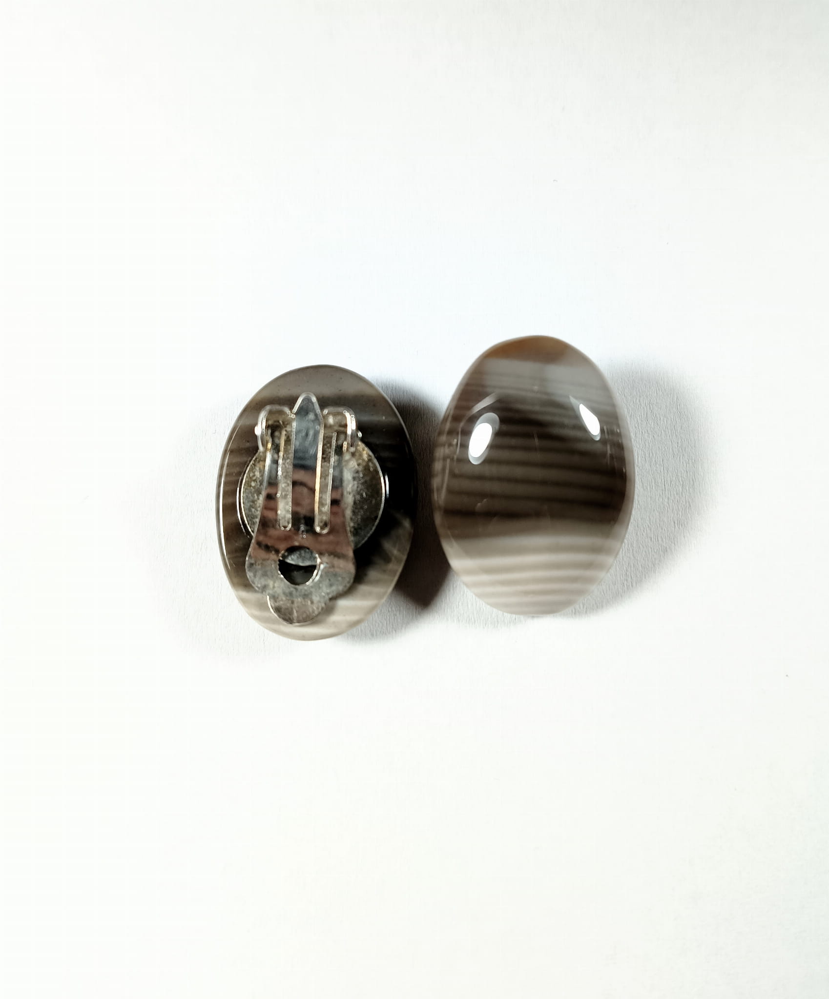 Owalne krzemienie pasiaste o niemal lustrzanym odbiciu zostały umocowane na metalowych klipsach klejem dwuskładnikowym jubilerskim, który jest niezwykle trwały.