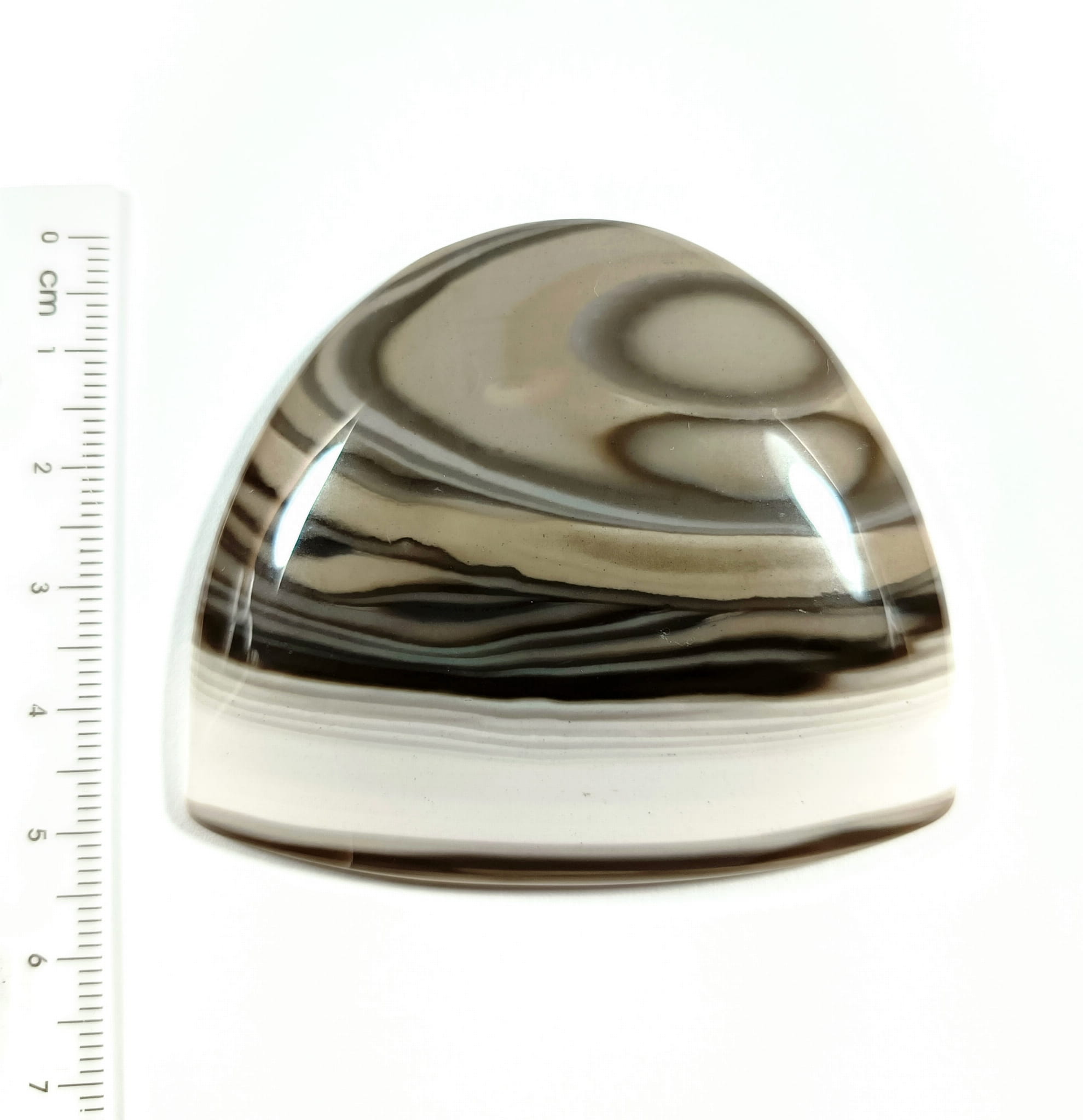Krzemień pasiasty, naturalny kamień ręcznie formowany w półokrągły kształt, szlifowany.