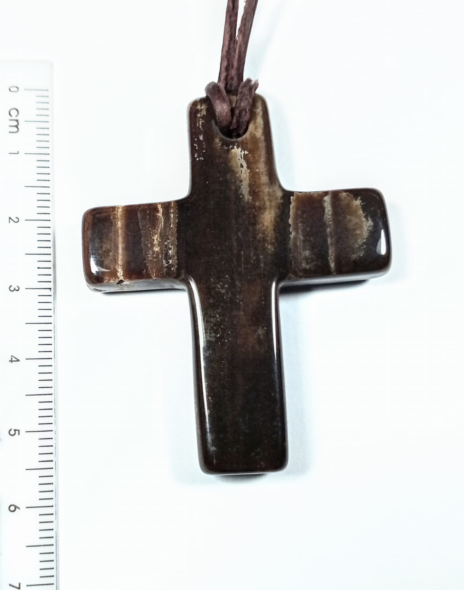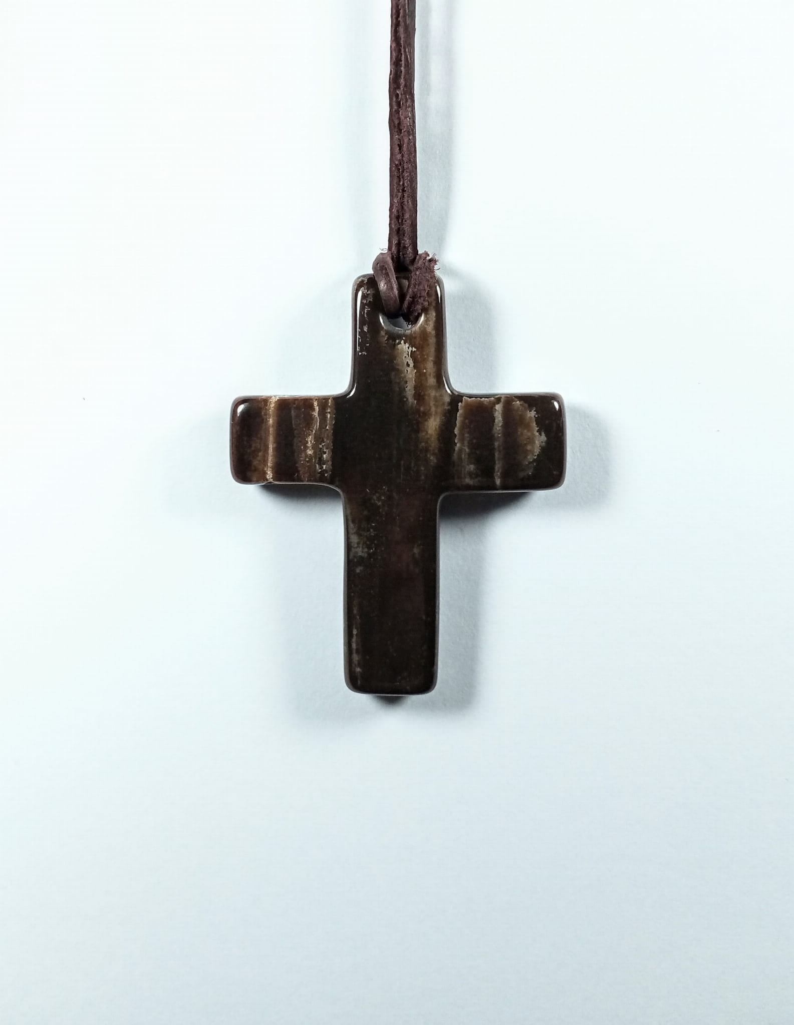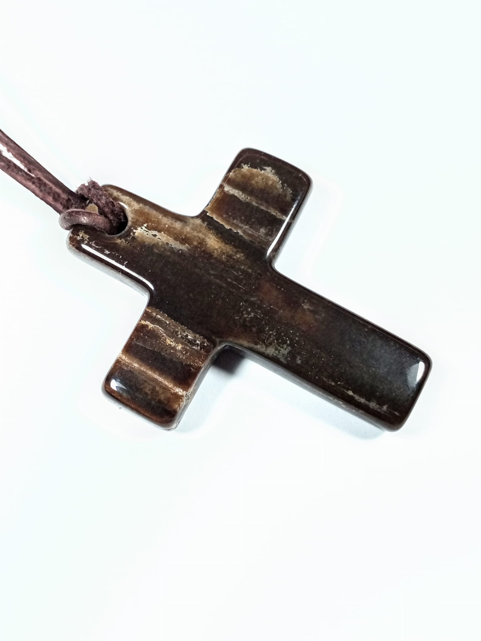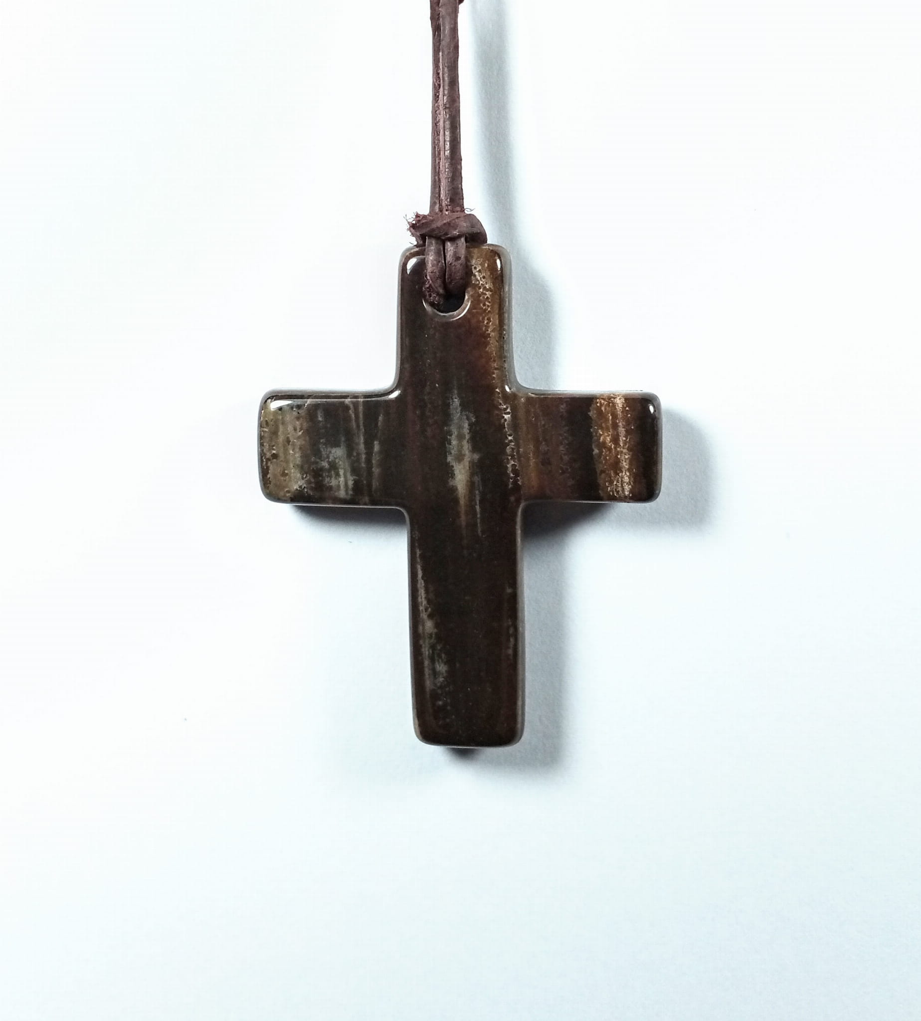 Krzyżyk z otworkiem, skamieniałe drewno, w komplecie rzemień naturalny brązowy