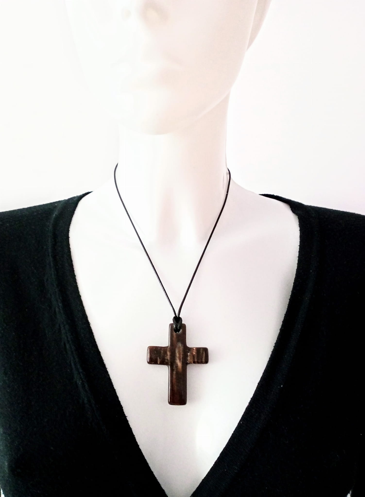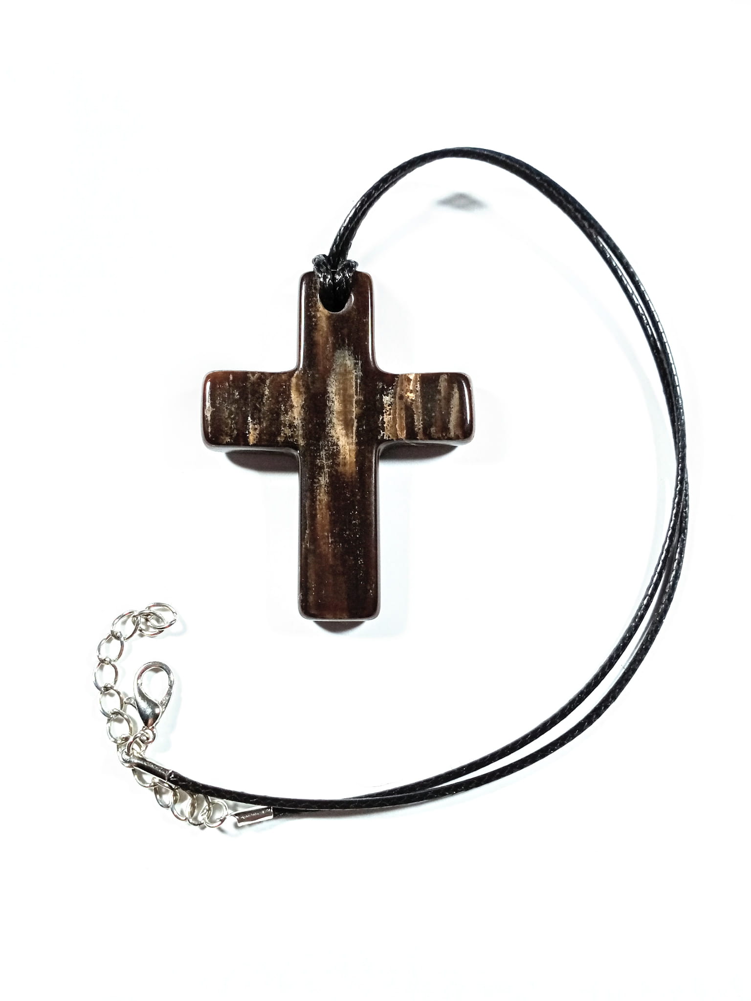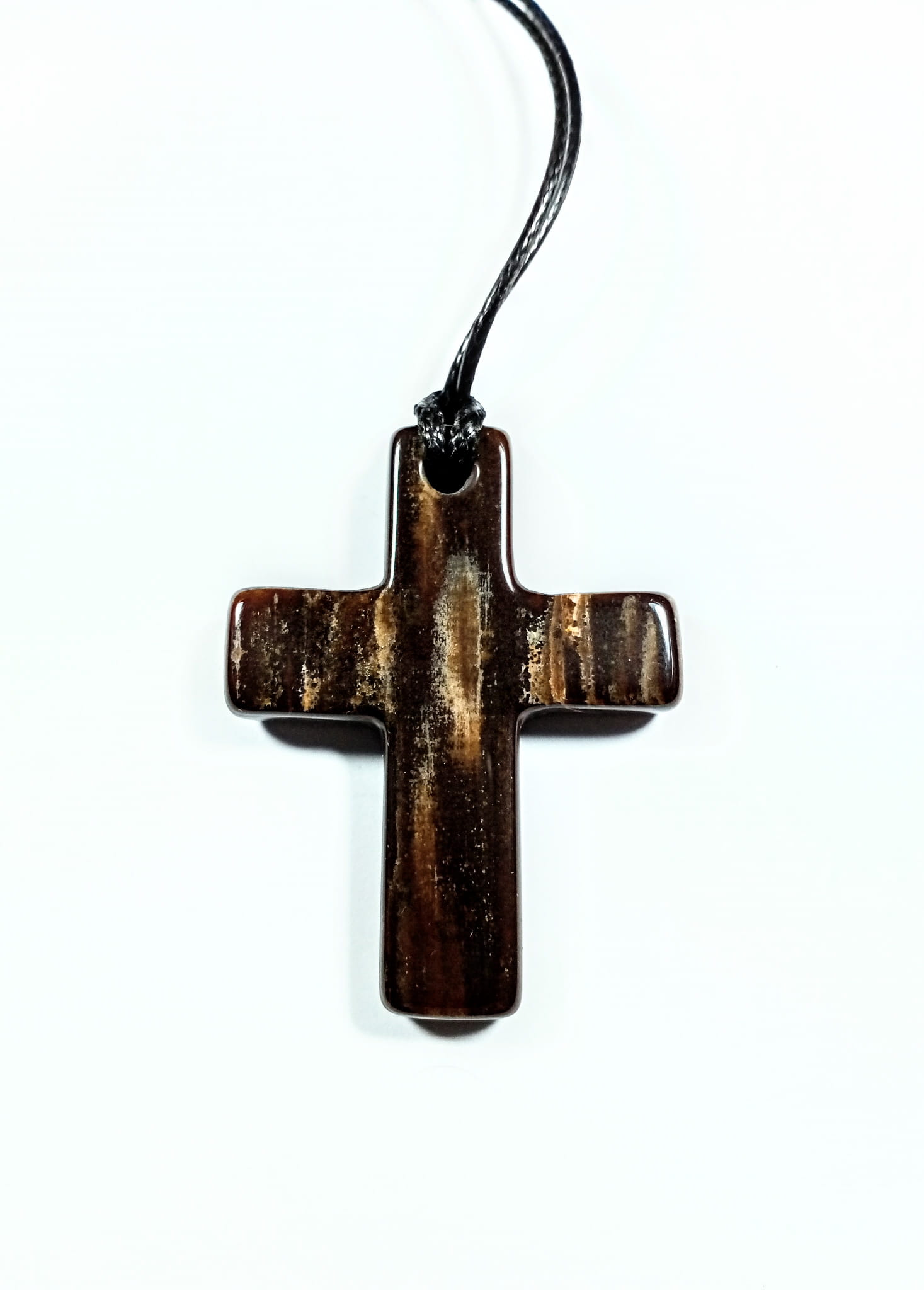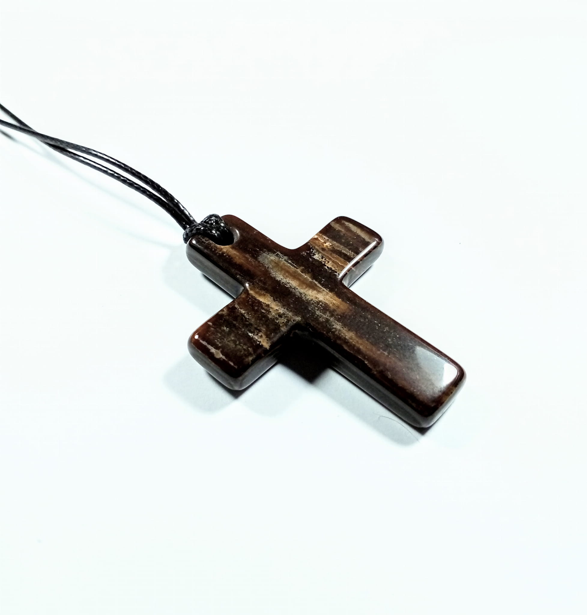 Krzyżyk ze skamieniałego drewna na woskowanym sznurku