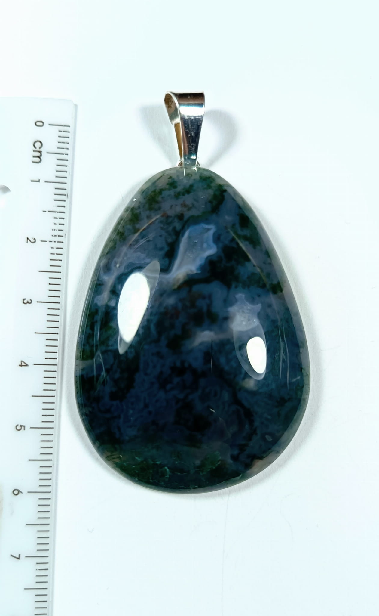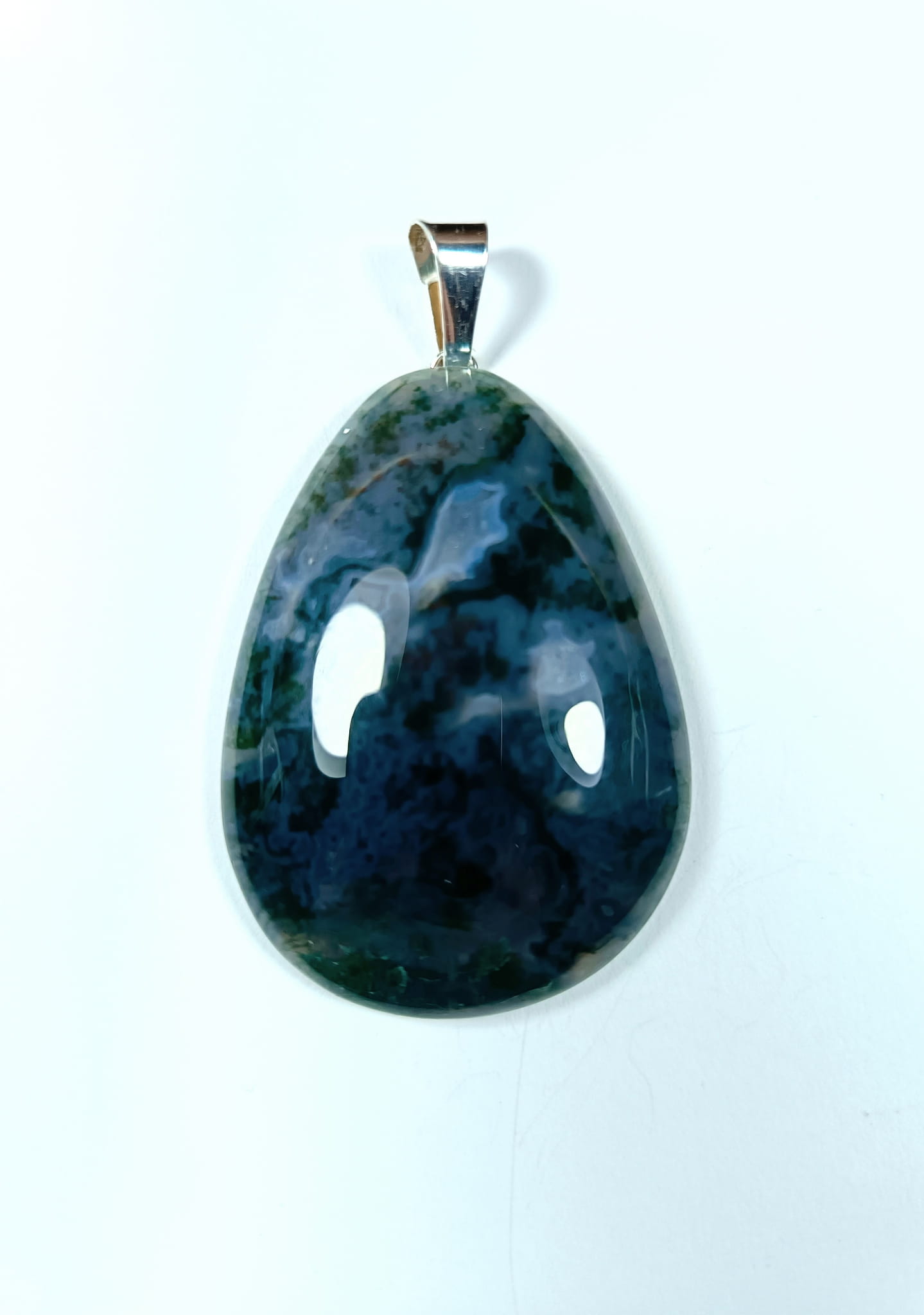 Wisiorek z agatu mszystego 43 mm z posrebrzaną zawieszką.