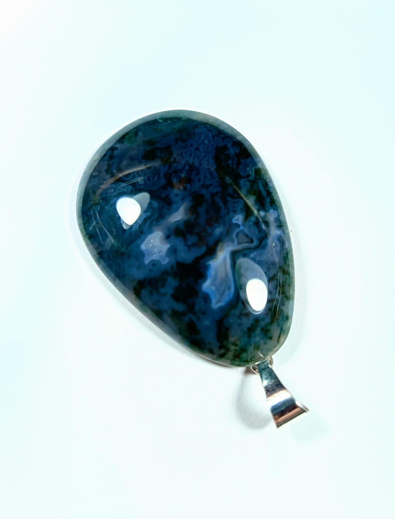 Wisiorek z agatu mszystego 43 mm z posrebrzaną zawieszką. Zielona głębia i piękno :).