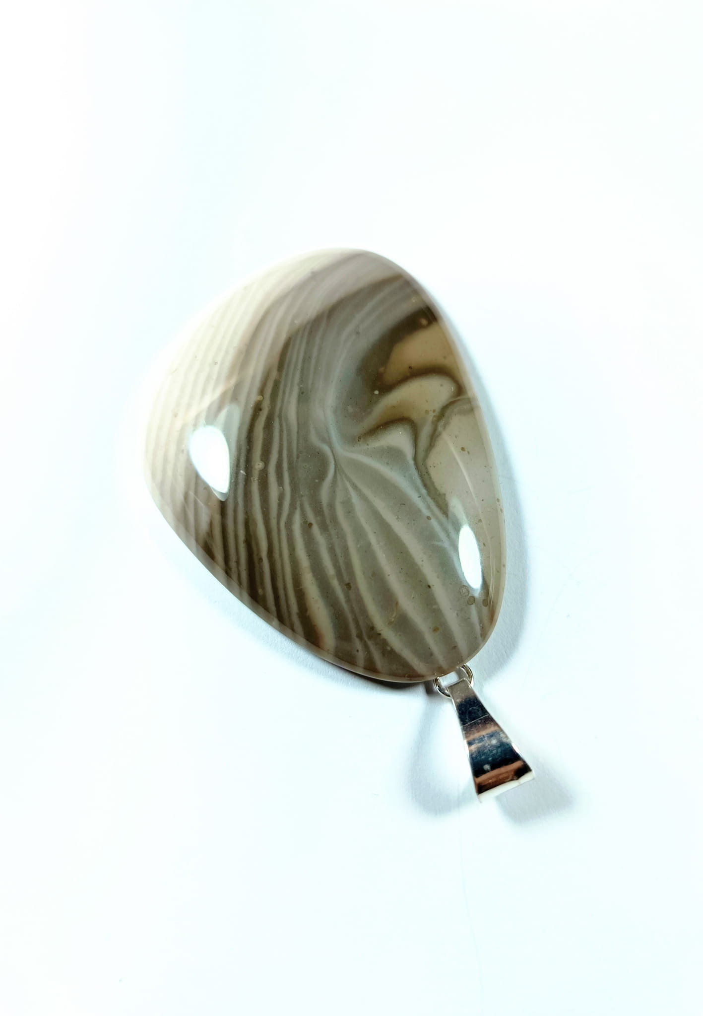 Mamy tu Wisiorek z krzemienia pasiastego o oryginalnym kształcie i naturalnych wzorach,