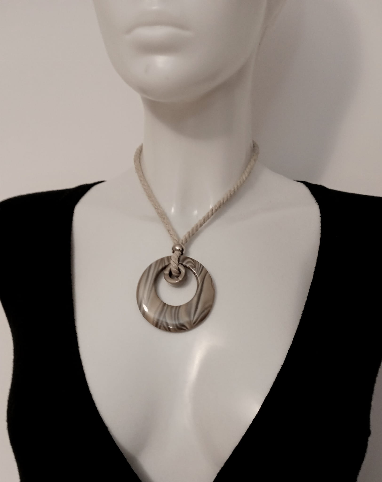Wisiorek składa się z dwóch okrągłych kamieni połączonych za pomocą naturalnego, lnianego sznurka.